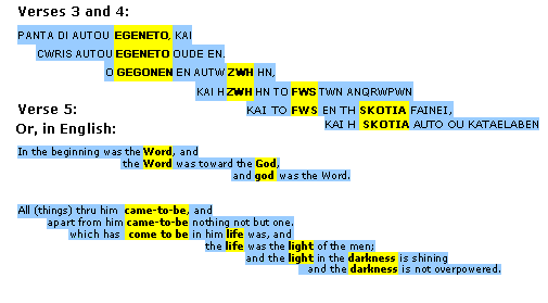 In John 1:1 we have transliterated the Greek in a straightforward way so that we can see how the major term (coloured yellow) of the former clause is picked up in the next clause. Commentators have dubbed this a “staircase” which we have shown in Diagram 1. The same point can be made with regard to John 1:3-5, and we show this in Diagram 2 below.