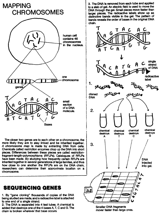 The techniques used to map and sequence human genes are complex, and are presented in the diagrams over the page. The reader uninterested in the technical details may wish to skip this part and continue reading the main article.