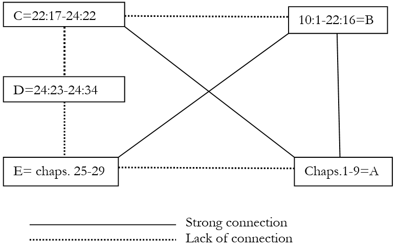 Snell highlights the work of Israeli scholar Jehoshua Grintz[11] who, rather than looking at repetitions, uses “expressions” (proverbial clichés) in order to posit a two stage composition of the book which can be represented graphically as follows: