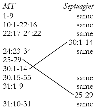 Grintz argues that A, B and C form the first edition with D and E (and possibly the remainder) forming the final edition in the time of Hezekiah. However, Snell disagrees with the methodology employed for identifying and selecting the “expressions” and remarks that affinity (between expressions) need not imply contemporaneity. Essentially, Grintz contends that the present order of Proverbs reflects the historical order in which it was composed but this is difficult to maintain as the Septuagint presents a different order, suggesting that the final (canonical) form was still fluid when the LXX was translated in the third century: