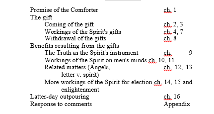 Chapters 14 and 15 have a close relationship, covering predestination and election and the Divine process of opening and closing eyes. The final chapter returns once more to a discussion on Joel 2. It considers a latter-day outpouring of the Spirit and applies the prophecy to the time of Christ’s return. Only an incipient fulfilment is recognised at Pentecost.