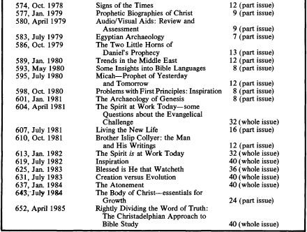 The perilous times required this approach, how­ever, and the Issue was widely acclaimed in the Brotherhood, almost 7,000 copies being printed and sold within a few months, with a considerable increase in regular subscribers accruing to the magazine as a result Articles by Brother John Watts on “The Theory of Evolution”, by Brother Peter Watkins on “The literality of the Serpent in Eden”, by Brother James Carter on “A Balance between Doctrine and ‘Good Works’, by Brother Edward Whittaker on “Bible Prophecy: Speculation or Revelation?”, and by Brother Elwyn Humphries on “Genesis or Geology”, are just a few of the many highlights of a magazine which reads as well today as it did twenty years ago when it first appeared. The whole Issue, written essentially to meet the pressing problems of the times, has stood the test of time as “a challenge to accept the Scriptures, on the spirit­ual, doctrinal, moral and historical contents of their Divine Revelation to man”.