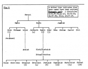 1 Chron. 23:21-22, mentioned wove, is in the context of the Levitical families of the time of David. We must suppose therefore that there were four such Merarite families comprising the descendants of Kish,son of Mushi (see genealogy where they are numbered 1 – 4). Since there are fairly clearly 9 Gershonite families and 9 Kohathite families in ch.23, it would be appropriate to have six Merarite families to make the total number of families 24. This would correspond to the 24 priestly orders in ch,24, and the 24 orders of singers in ch.25. However, there seems to be no way in which this can be done, without doing great violence to the text.