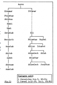 Nothing is recorded in Scripture about when or why the high-priesthood passed from the line of Eleazar to the line of Ithamar. Josephus records that the high priests continued to be of the line of Eleazar until Uzzi (see Fig.13), and then Eli took over (Antiquities of the Jews, Book 5, ch.11:5). This is reasonable. Zadok and Abiathar were contemporaries when David ruled. Four generations back from Abiathar is Eli; four generations back from Zadok is Zerahiah, the son of Uzzi. Whatever the circumstances of the change, it would appear to have been at God’s instigation, for in 1 Sam.2:30 we read, as part of the warning to Eli from a man of God: