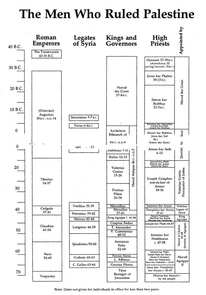 The first name in the chart which attracts our attention is Annas the son of Seth, appointed by Quirinius in A.D. 6. He became the head of one of the most influential high priestly families in the closing decades of the Second Temple. Five of his sons, Eleazar (A.D. 16-17), Jonathan (36-7), Theophilus (37-41), Matthias (42-3) and Annas II (61-2), one grandson, Matthias, son of Theophilus (65-8), and a son-in-law, Joseph Caiaphas (18­36), became high priests. He himself ‘ retained the priesthood from A.D. 6 to A.D. 15, when he was deposed by the procurator Valerius Gratus in favour of Ishmael, son of Phabi, who, in a second period of office (58-60), apparently was the last high priest to slay the red heifer as required by Numbers 19:1-7.