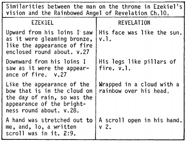 There can be no doubt that here in Ezekiel 1. we have the Rainbowed Angel of Revelation 10, as the following comparison demonstrates: