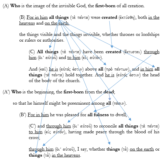 We have set out a commonly proposed structure of the poem in English below. This is not particularly controversial; it’s a little literal in how it renders the prepositions, but it largely copies that of Wright.[8] The main point to make is that the second (A’) clause gives the basis for the first (A) clause.[9] Christ is pre-eminent among all and this is his status as the firstborn of all creation; but this is based on his being the firstborn from the dead.