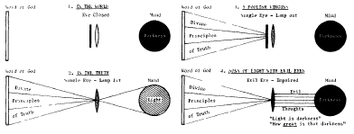 In the charts above the Bible is represented by the ”Word of God” on the left, the eye by the lens in the center and the mind by the circle on the right. In chart I the closed eye is illustrated as having a shutter in front hence there is no reflection upon the Word of God, no spiritual sight, and the mind rests in darkness. Chart 2 represents a man in Christ, with an open or single eye reflecting upon the Word of God and thereby transmitting divine principles which flood the mind with light. Chart 3 illustrates the 5 foolish virgins: although they were in the Truth” (eye shaded as in chart 2) and therefore had “single eyes”, they had ceased to meditate upon the Word of God (represented by a shutter in front of the eye) allowing their lamps to go out and flood the mind with darkness. Those illustrated in chart 4 are “sons of light”_________ still in the Truth—but the evil or impaired eye, representing evil or critical thoughts of others, loses its power to transmit “light” properly and so the divine principles cease to penetrate the mind and “light becomes darkness”. Only the man illustrated by chart 2 will gain the Kingdom! He has his loins girded about and his lamp burning.