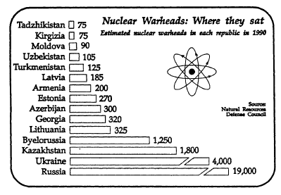 Although Boris Yeltsin has taken control of the Kremlin, including weapons and staff, he has yet to validate the START treaty. He cites more pressing issues on the home front as his reason. The New York Times of January 5 further reports that nuclear warheads currently located in Kiev, Ukraine, are being transported to Russia. This will add to the abundant supply of nuclear warheads currently in Russia (see below).