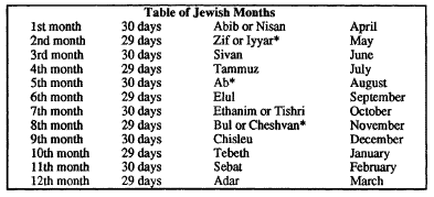 The names of the 12 Jewish months, some of which picked up a second name after the Babylonian captivity, the length of these months, and the corresponding months in our calendar are given in the table below. An asterisk next to the name of a Jewish month indicates that the name does not appear in the Bible.