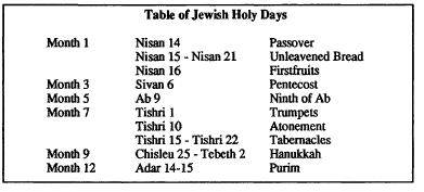 In addition to the holy days listed in these five calendars, every year the Jews celebrate Purim (Heb. for Lots), Hanukkah (Heb. for dedication), and the Ninth of Ab (the fifth month). Purim, which memorializes the reversal of Haman’ s plan to kill the Jews in Persia, is celebrated on Adar 14 and 15 (Esth. 9:20-32). Hanukkah, which celebrates the cleansing of the temple by the Jews under Judas Maccabaeus three years after it had been profaned by the Syrians under Antioch us Epiphanies, is celebrated for the eight days from Chisleu 25 to Tebeth 2(1 Macc. 4:52-59,2 Macc. 1:18, 10:1-8; cp. Jn. 10:22). The Ninth of Ab, the most important of the four historical feasts, commemorates the burning of the temple by the Babylonians (Zech. 7:3-5, 8:19,2 Kgs. 25:8-9, Jer. 52:12-13).