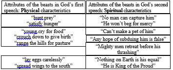 Table 13_1: Contrast between the physical characteristics of the beasts in God’s first speech with the spiritual characteristics of the beasts in God’s second speech.