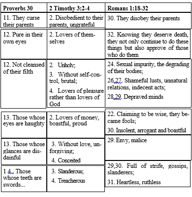 Is Agur speaking of a particular period of time in which evil predominates? Or is he speaking of a particular class of people who might well be found in any generation? Either option seems possible. However, the similarities between these verses and Paul’s description of the “terrible times in the last days” (2Tim 3:1-7, particularly vv 2-4) may point more toward the first option. Consider some of the parallels with 2 Timothy 3, along with Romans 1 also: