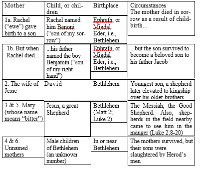 - Later, in Jeremiah 31, the prophet sees a time when, after great trials, the LORD will save a remnant of Israel out of their captivity, including “expectant mothers and women in labor” (v 8). Meanwhile, “the voice of Rachel” will have been heard, in Bethlehem, “weeping for her children… because they are no more” (v 15). Nevertheless, the LORD says to those mothers who weep: “Restrain your voice from weeping and your eyes from tears, for your work will be rewarded… They will return from the land of the enemy. So there is hope for your future… Your children will return to their own land” (vv 16-17).