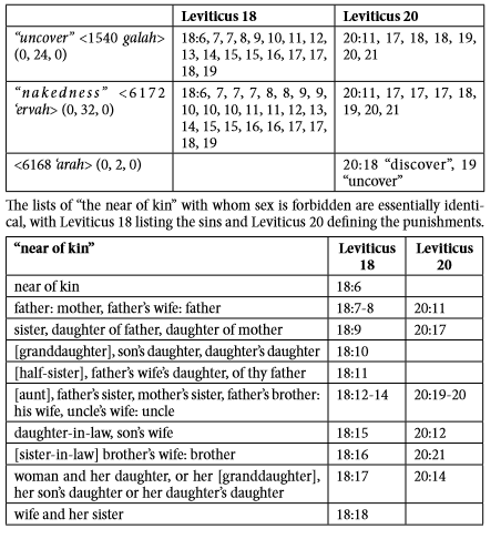 The words “uncover” (0, 24, 0) and “nakedness” (0, 32, 0) occur throughout these two chapters, and nowhere else in Leviticus: