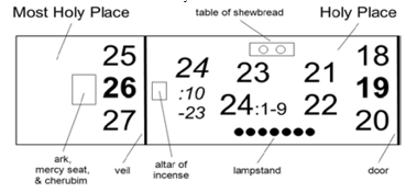 Figure 4. Leviticus 18-27 placed on the floor plan of the tent of the Tabernacle, showing the alignment of Leviticus 18-24 to the Holy Place, and Leviticus 25-27 to the Most Holy Place.