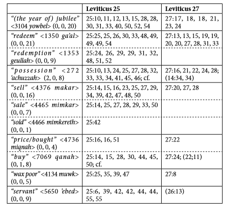 Leviticus 25-27 is another doorway composition: Leviticus 25 and 27 frame Le­viticus 26. In the book of Leviticus the words “jubilee”, “redeem”, “sell”, and “wax poor” occur only in chapters 25 and 27; and the words “possession”, “buy”, and “servant” are used almost exclusively in these two chapters: