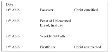So, let us consider what else happened in the first month of religious calendar, Abib. On the 14th day, Passover occurred: “In the fourteenth day of the first month at even is the Lord’s Passover” (Lev 23:5). That was the day that Christ died. On the 15th day of the first month, the first day of the feast of unleavened bread was observed: “And on the fifteenth day of the same month is the feast of unleavened bread unto the Lord: seven days ye must eat unleavened bread. In the first day ye shall have an holy convocation: ye shall do no servile work therein” (Lev 23:6-7). That was a Sabbath day. Then, on the week when Christ died, there was a weekly Sabbath on the 16th day of the month (Matt 28: 1) On the morrow after the weekly Sabbath, the first fruits offering was made. On that day, the priest took a male lamb and offered it as a burnt offering, and he took a sheaf of barley from the firstfruits of the harvest and waved it before God: “Speak unto the children of Israel, and say unto them, When ye be come into the land which I give unto you, and shall reap the harvest thereof, then ye shall bring a sheaf of the firstfruits of your harvest unto the priest: And he shall wave the sheaf before the LoRD, to be accepted for you: on the morrow after the sabbath the priest shall wave it. And ye shall offer that day when ye wave the sheaf an he lamb without blemish of the first year for a burnt offering unto the LoRD” (Lev 23:10-12).