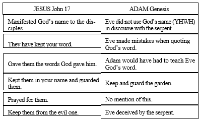 Jesus’ service on behalf of the disciples contrasts with Adam’s service on behalf of Eve. Extending the principle set out by Paul in Rom 5:14-21 and 1Cor 15:45-47, the Second Adam accomplished something that the First Adam didn’t. The table below lists the specifics of his ministry that Jesus cites in this prayer, and contrasts them with what Adam apparently failed to do in his stewardship.