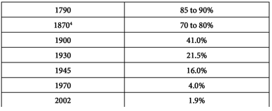 - Data taken from the “Economic Research Service”, United States Department of Agriculture. Interestingly data for 2007 from the United Nations shows approximately 1.9% of the population of the United Kingdom workforce was involved in agriculture and only slightly higher figures applied for France, Germany and Italy.