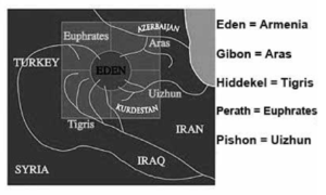A river flowed from Eden to water the garden, and from there it divided into four head-waters: Pishon, Gihon, Hiddekel, and Perath (Gen 2:10-14). Hiddekel was known among the Jews as the Tigris river (present day Iraq), while the Perath was known to the Greeks as the Euphrates.7The source of both rivers is located near Lake Van and Lake Urmia, both of which lie in the mountains of Armenia. The identities of the two other rivers — the Pishon and the Gihon — have long remained a mystery.