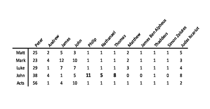 Table 1 highlights a difference between John and the Synoptics. Philip, Nathanael and Thomas are only mentioned in lists of names in the Synoptics, but John gives glimpses of their experiences and spiritual development. John tells us it was Philip that Jesus tested, asking where they could buy bread to feed the 5000 (6:5-7); that it was Philip to whom certain Greek proselytes came “saying, ‘Sir, we would see Jesus’ ” (12:20-21); that it was Philip who said “Show us the Father,” prompting Jesus’ response “Have I been so long time with you, and dost thou not know me, Philip? he that hath seen me hath seen the Father; how sayest thou, ‘Shew us the Father?’ ”