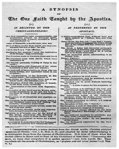 The “Synopsis of the One Faith” was written by John Thomas, true founder a of the Christadelphian community, in 1867. It included one section on “As Believed by Christadelphians”, and a second section entitled “As perverted by the Apostacy”, both of which are as reproduced here.