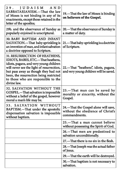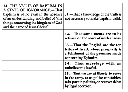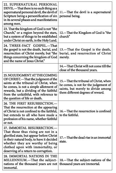 - There were also several other changes generated by basically life issues: jury service, military service etc. which were added at various times from 1883 on, as the number of doctrines to be rejected grew from the 31 in the 1883 version, to 32 by 1891, and the current number of 35 by 1911. The last change in 1919 was a modification of # 35, when phrase “or as police constables” was passed in a failed attempt to head off what became the “Berean” division. Note that one of the clauses “5a. – That Christ was of a different nature from other men” was dropped.