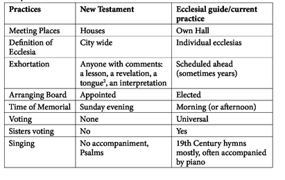 Of course, you can find ecclesias that do not follow some or all of these traditions in the last column, but I believe that our current practices are fully appropriate for the purposes of ensuring the “all things should be done decently and in order” (1 Cor 14:40). My point is not to disparage the way we conduct our meetings, but to point out they are based, not on Biblical precepts and examples, but mainly on those that were common in Robert Roberts’ time among the churches he was familiar with. So our practices are not “cast in stone”: in following them we follow the precepts of man, neither of God or Christ, nor by inspiration, or the apostles.
