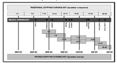 The chart below, based on the proposed revision by archeologist David Down, illustrates the contrast between the Conventional Egyptian Chronology and Down’s revised chronology.