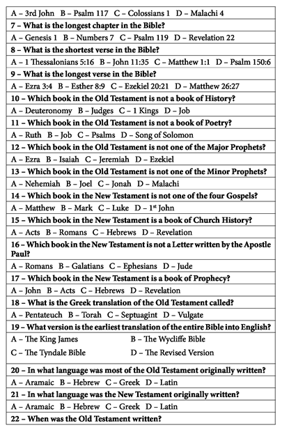 Here are two ready-to-use, multiple-choice Bible games. They’re easy to organize and play. Both games come with several questions that have four answer choices. Any number of teams can play, and each team will need a set of answer cards labeled A, B, C, and D, corresponding with the answer choices. Bible use is always a good option to offer with these games.