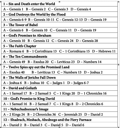 If you would like ready-to-use, printable copies of these Bible games, contact me at the Sunday school email address below. I will send them by reply email. Other ideas for Bible games were published in The Tidings, March-April, 2014, pp. 127­ 30. You can also find a few game ideas pinned to the Bible Games board on our Sunday school Pinterest site.