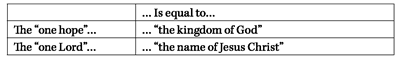 “One hope” encompasses much of what Christadelphians, particularly and uniquely, believe. We have only to think of the Book of Acts, where “the hope” is variously defined as:
