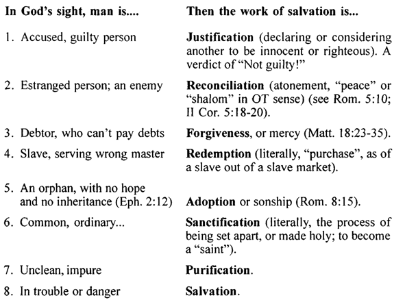 In writing of salvation in Christ, the apostle Paul especially uses various words. These are words which, through a superficial familiarity, we may come to use interchangeably, not appreciating the shades and nuances of meaning, or the principles involved. Some examples (these words will occur again and again in our further studies):