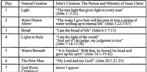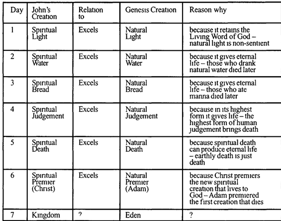 A recurring theme of all six creative days in John’s Gospel is the superiority of the spiritual creation’s component to its natural counterpart; and always for the same reason: where death is found in the natural form, life is seen in the spiritual. This is not a vague generalization, but explicitly justifiable in each instance (Table 2).