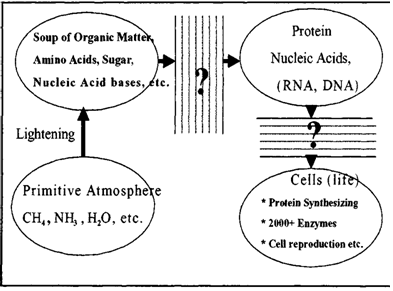of approximately how the sequence of life was supposedly created. The question marks represent the principal “unknown” mechanisms.