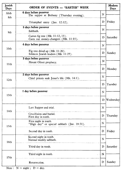 There are certain references in the Gospels which inexorably place the order and timing of some of the events leading up to the Last Supper. John 12:12 tells us that the triumphal entry took place on the “next day” after the supper at the house of Simon the Leper. Mark 11:12-19 tells us that the cursing of the fig-tree and the casting out of the money-changers took place “on the morrow” after the trium­phal entry. Mark 11:20-33 tells us that it was “in the morning” of the next day that the fig-tree was observed to be withered away, and that Jesus put the Pharisees, and other Jewish groups, to silence. It was probably as he went out of the temple that evening (Mk. 13:1) that the question of his disciples prompted Jesus to utter the Mount Olivet prophecy. Then Mark 14:1 tells us that two days before the passover the Jewish leaders were still seeking how they could put Jesus to death. Our chart therefore is based upon all these considerations.