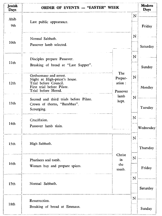 If now we put all these suggestions together we can construct a chart setting out the order of events. It should be noted that the days shown are primarily Jewish days in the month Abib (sometimes also called Nisan) as given in the first column, and the dividing line is at 6 p.m., the nights preceding the days as is the Jewish custom. This is shown in the third column where the nights are shown by the capital N (see facing page).