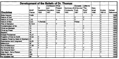 The way I have approached the topic is to look at the various “statements of faith” that Dr Thomas produced over his lifetime, and compare them with one of our current statements, the BASF Most other writers have analyzed Elpis Israel and Eureka for the beliefs of Dr Thomas, so I have included those works for completeness However, the statements are much simpler to analyze, and presumably reflect his thinking on the crucial elements of the Gospel at the time when written I must point out I could write an article on almost every line item and check mark in the table, and sometimes the statements of Dr Thomas and those of Robert Roberts approach the same doctrinal point from different perspectives (Robert Roberts wrote the bulk of what is now known as the BASF around 1873) I apologize in advance for any errors in the tables, but I think they give a valuable insight into the development of the beliefs of Dr Thomas They also warn us as to the great dangers of quoting Dr Thomas out of context!