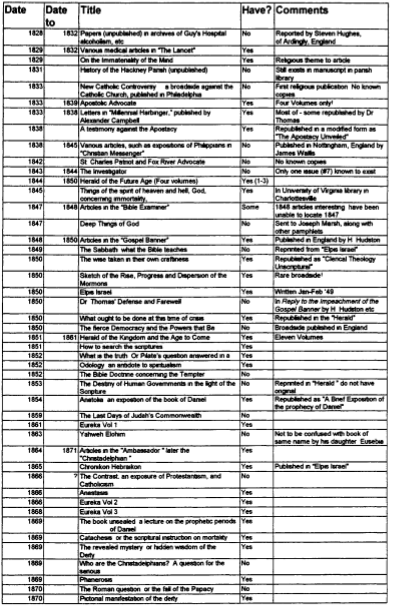 In my accounts of the life and times of Dr. Thomas, I have made frequent references to the beliefs of Dr. Thomas, and pointed out how they changed over the years. It is undoubtedly true that Dr. Thomas had arrived at the kernel of his and our understanding of the gospel by 1847, when he published his Confession and Abjuration. It is not true that he had by then arrived at a correct understanding of many elements we would consider “first principles” by that date. However, the whole subject is too big to be adequately covered in the space of one article, so all I will do is summarize the evidence in a tabular format I also include what I believe is a reasonably correct bibliography of Dr Thomas’ literary output.